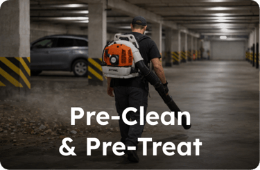 First we sweep and clear debris, then pre-treat heavy oil spots, ramps, and high-traffic lanes.