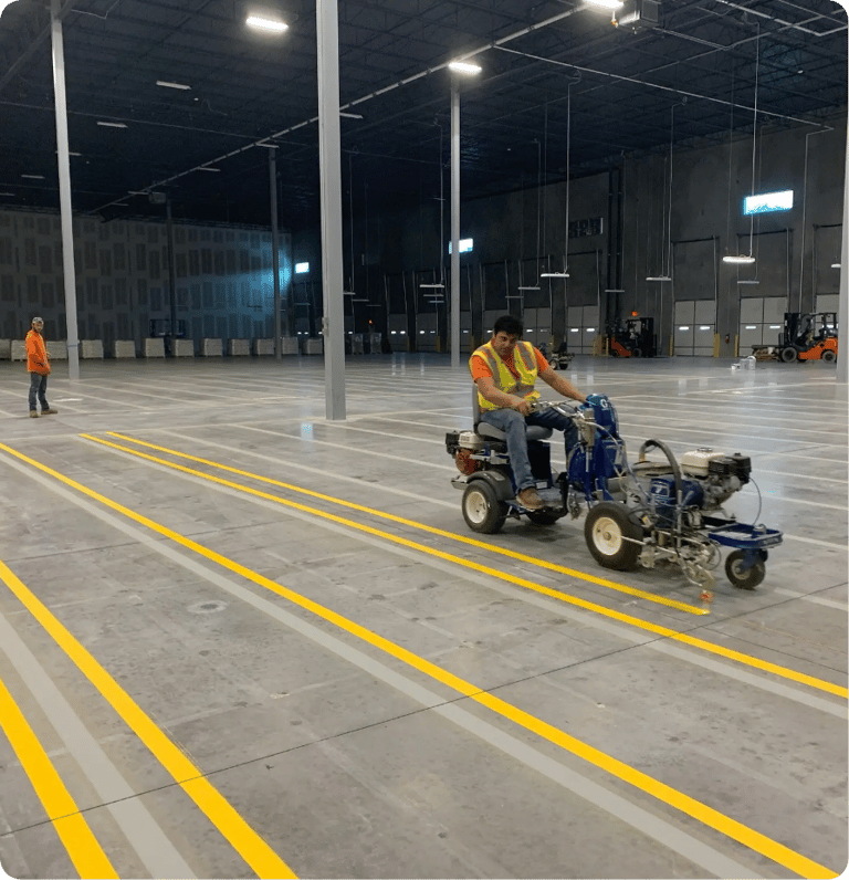 Our 3-Step Warehouse Striping process, layout, application, and final walkthrough, keeps your operations clear and consistent so your team knows exactly where to go and what belongs where.